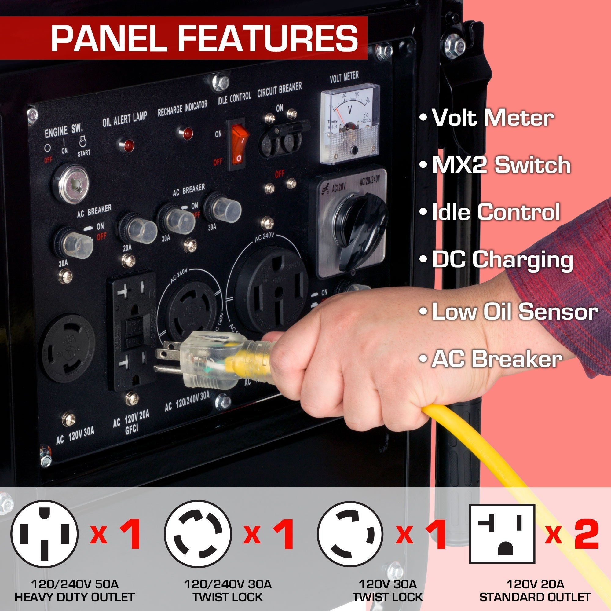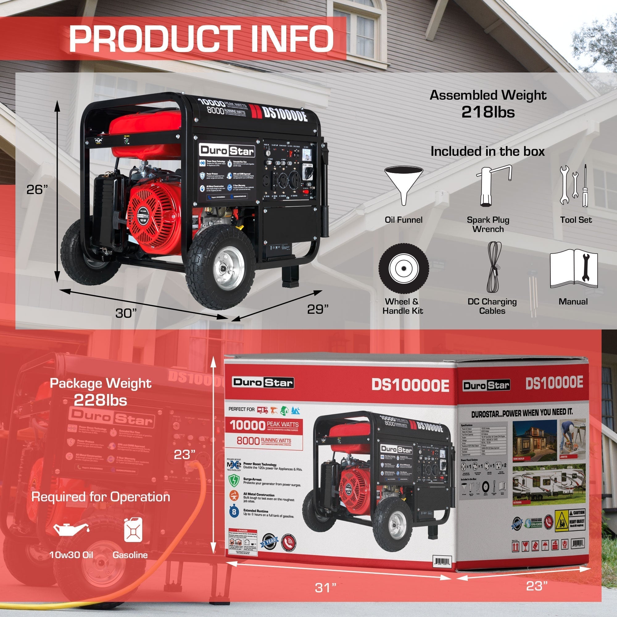 | What’s in the Box? | DS10000E Generator, Oil Funnel, Spark Plug Wrench, Tool Set, Wheel & Handle Kit, DC Charging Cables, and Owners Manual |