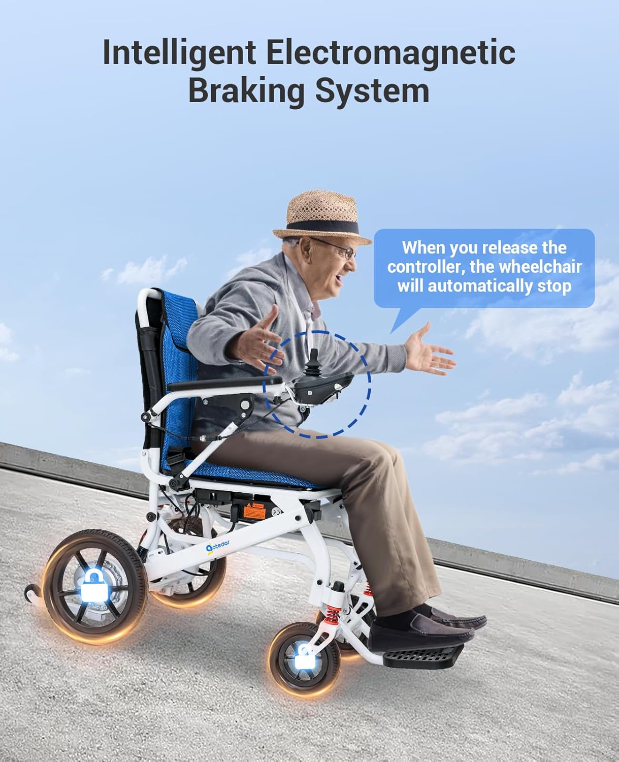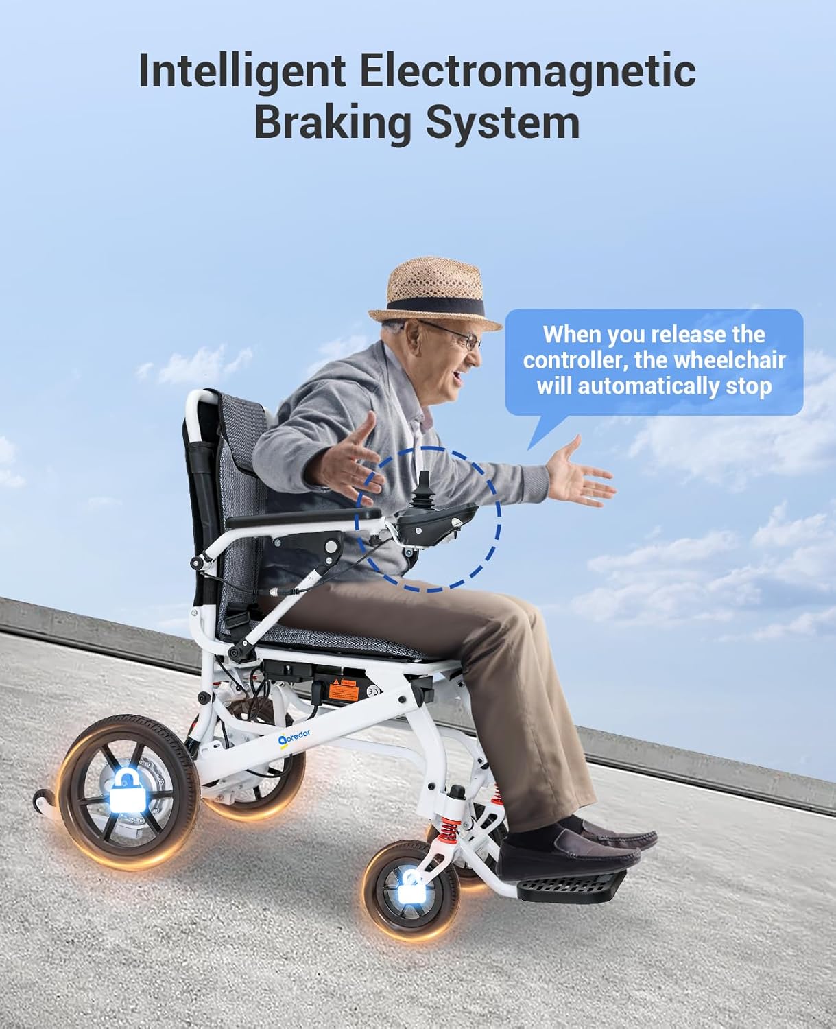 Equipped with electromagnetic brakes, shock absorbers, anti-tip wheels, and a weight-balanced frame for enhanced stability and control. Automatically engages tilt prevention when the joystick is released. -