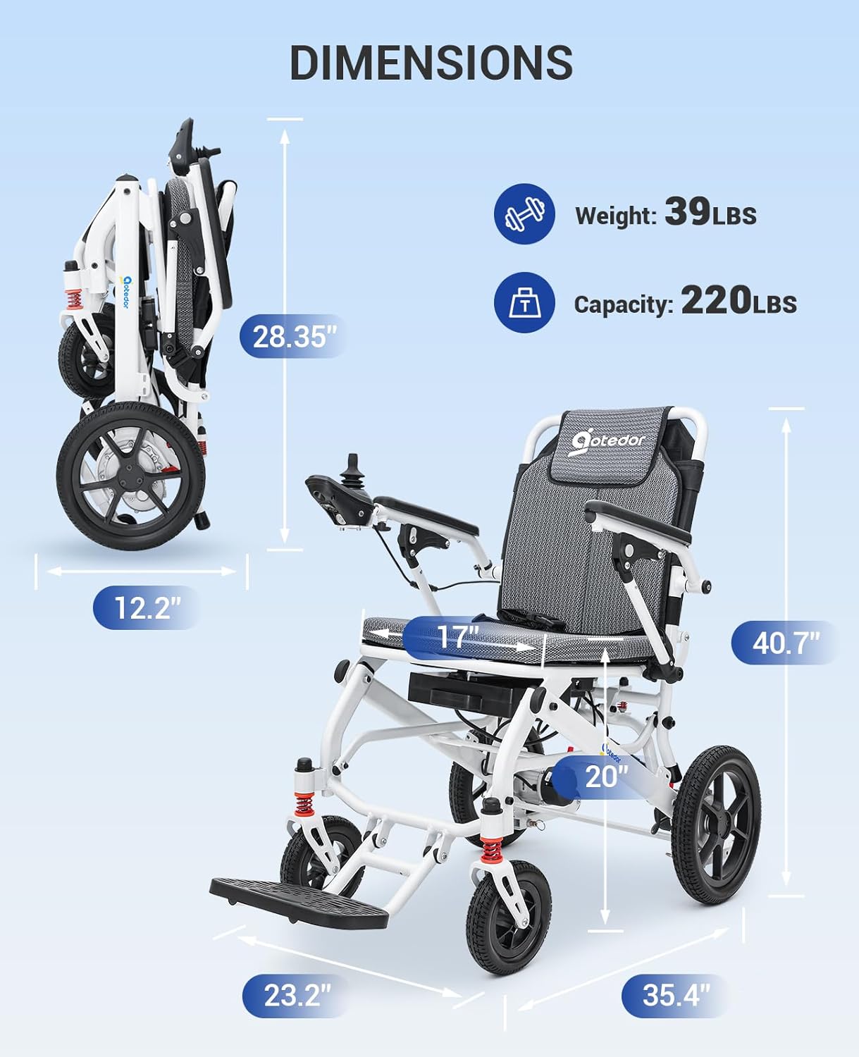 Ultra-Light Folding Electric Wheelchair – 22-Mile Range, Dual Lithium Batteries, 39 lbs Lightweight Power Chair for Adults – All-Terrain, Airline Approved