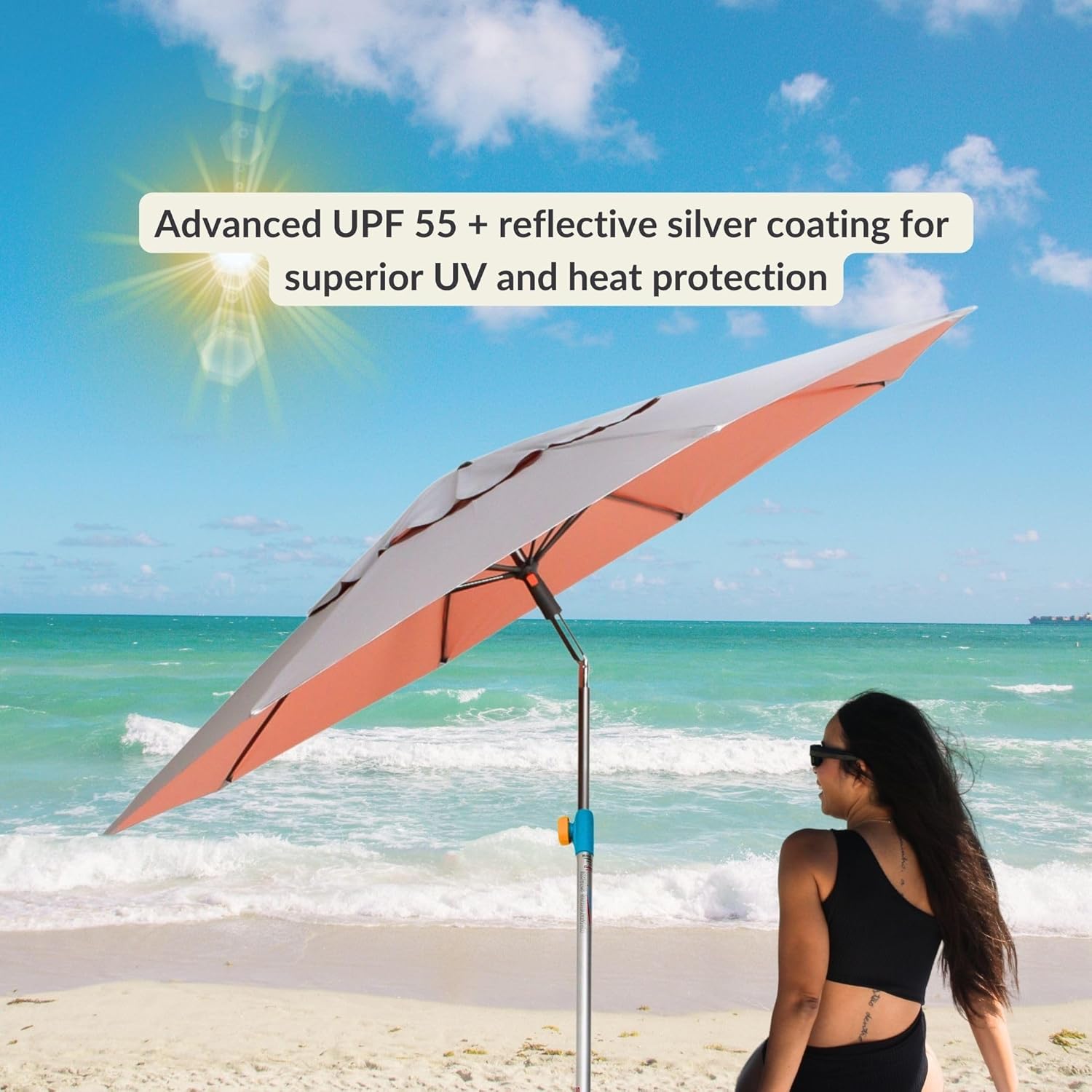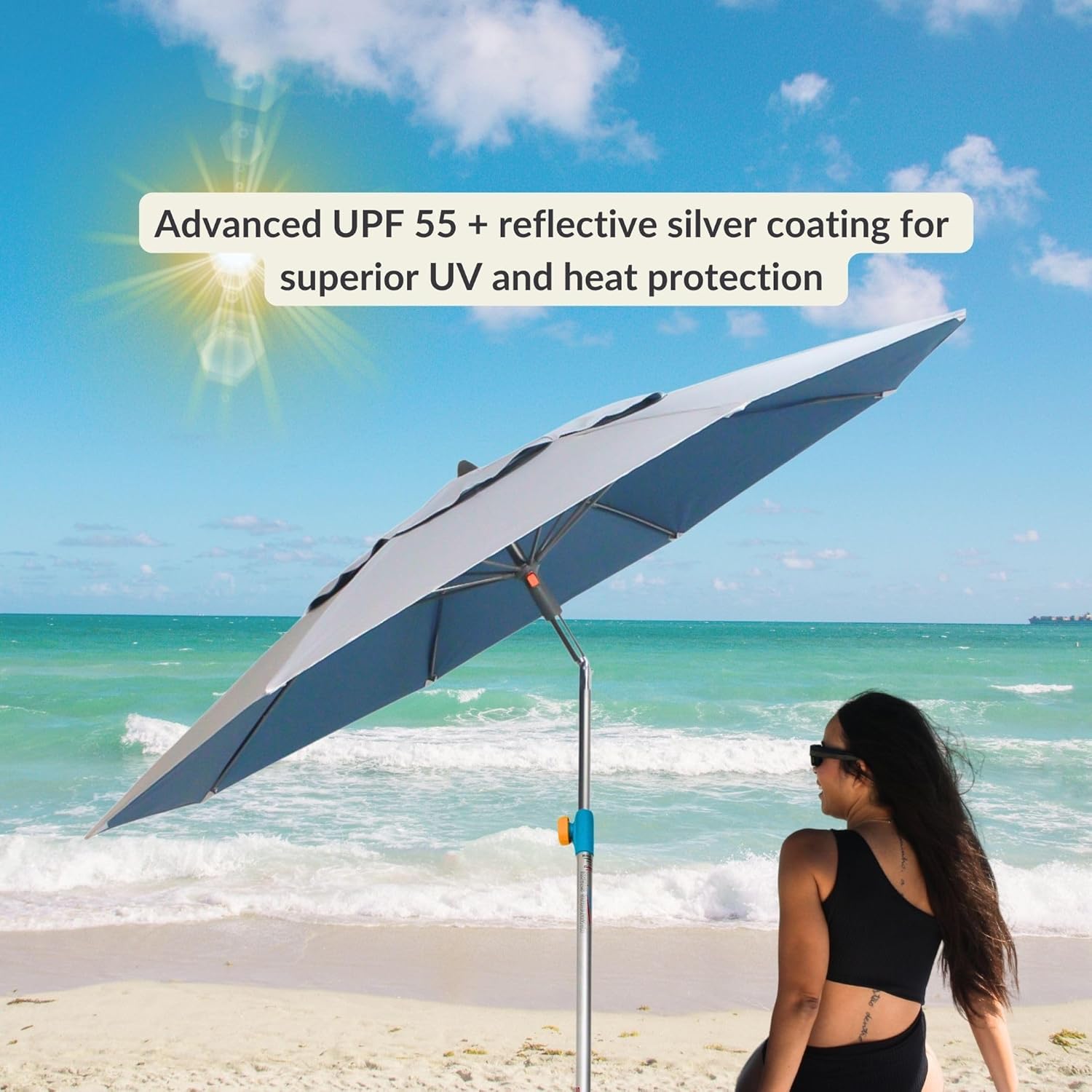 Large 7-foot silver-coated canopy offers UPF 55+ sun protection, blocking 99% of harmful UVA and UVB rays. Reflective coating helps reduce heat buildup underneath for a cooler, more comfortable experience. -