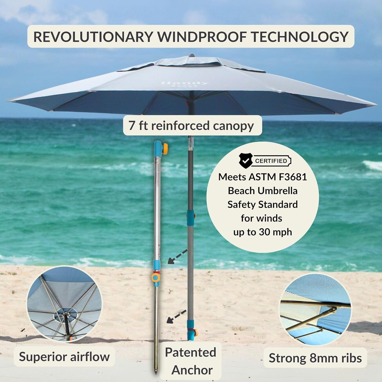 Engineered to stay upright in wind speeds up to 30 mph, as certified by ASTM F3681-24 standards. Features an 8mm-thick rib system, deep-set anchor, and wind-dissipating mesh vent for enhanced airflow and reduced lift. -
