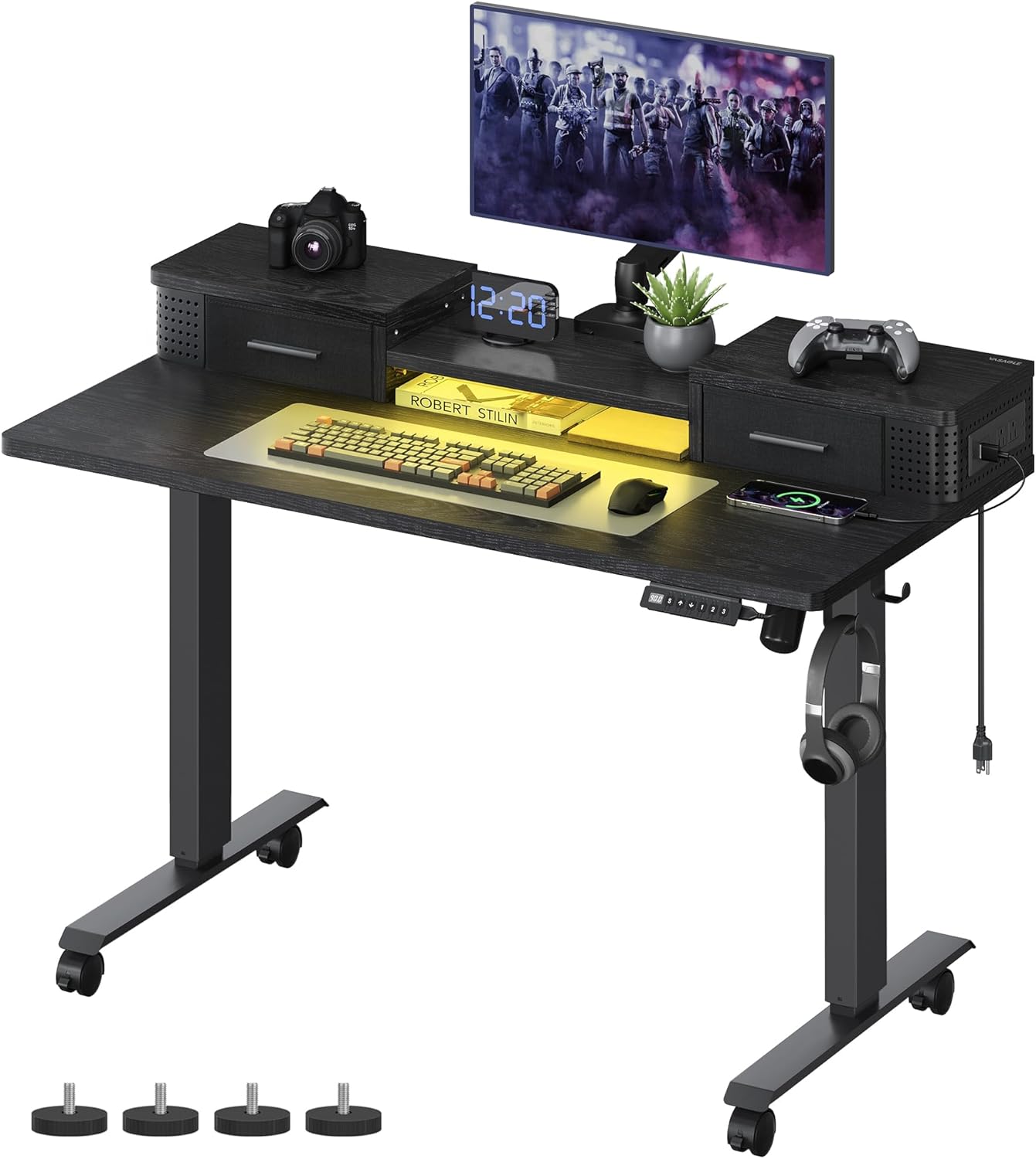 VASAGLE Electric Standing Desk – 47.2″ Adjustable Sit-Stand Desk with LED Lights, Drawers, Power Outlets, and Memory Settings – Ink Black